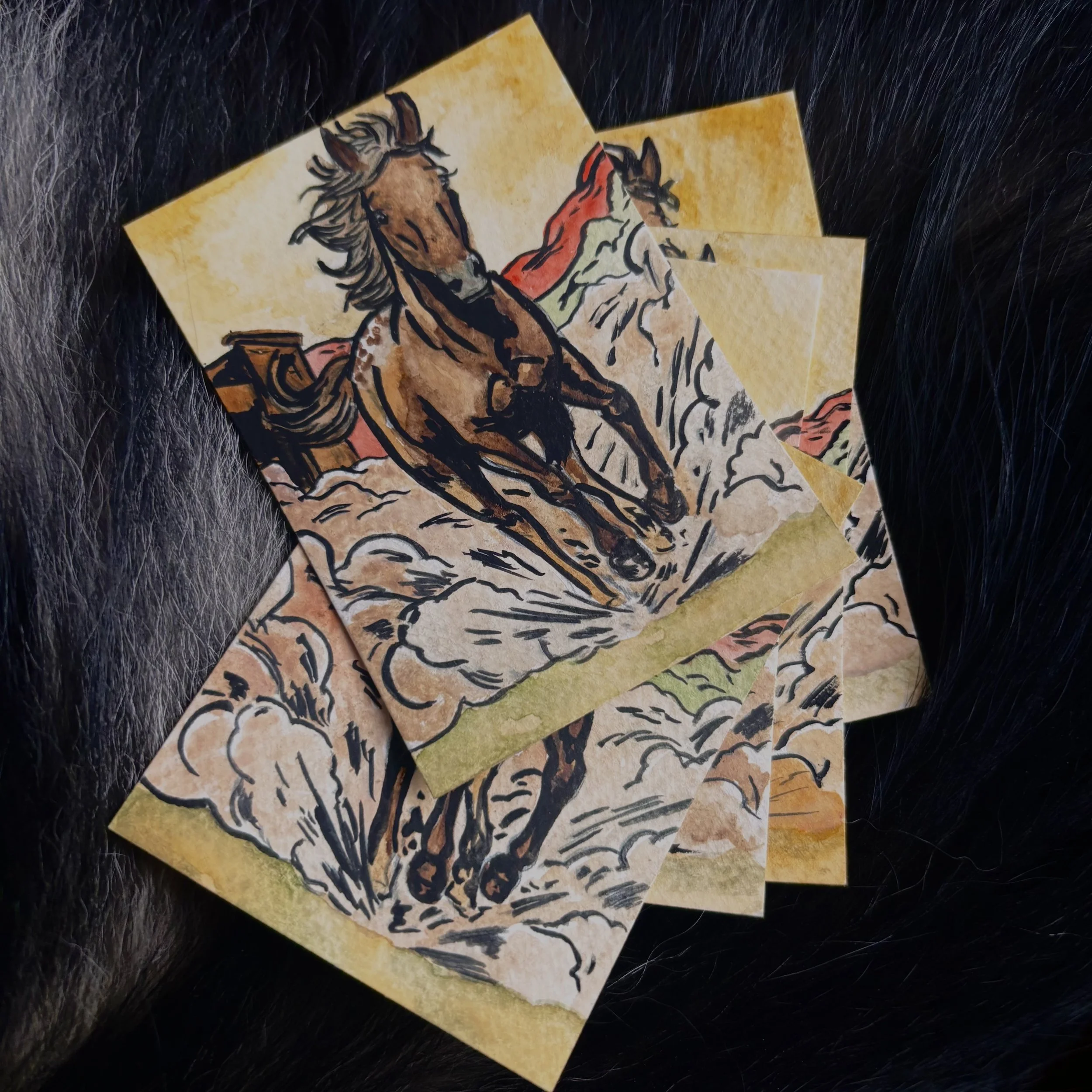 At ACEO size (the size of a baseball card), every line has to count. There’s not much room for detail, so it becomes more about suggestion when trying to capture movement, energy, and just enough form to let your brain fill in the rest. That’s part of why I chose this subject. A running horse already has that builtin motion, and the comic style let me push that even further without getting bogged down in realism.